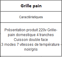 Puissance : 220V – 4 tranches Cuisson double face – 3 modes – 7 vitesses de température – noir/gris