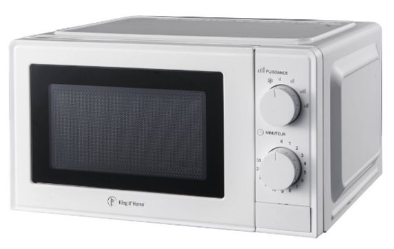 Capacité : 20L – Puissance : 700W (6 niveaux) – Minuterie : 30mn – Plateau tournant en verre diamètre 24,5 cm – fonction décongélation