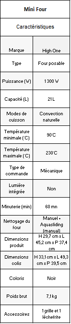 Dimensions : H 29,7 cm * L 45,2 cm * P 37,4 cm – Capacité : 23L – Puissance : 1300W