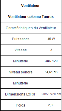 Dimensions : 62 cm * 62 cm * 125 cm – Puissance : 45W – Niveau sonore : 65dB – Mode : 3 vitesses
